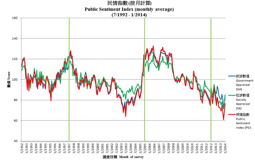 Latest Figures From 2014, POP enhanced the previous simple weighting method based on age and gender distribution to “rim weighting” based on age, gender and education (highest level attended) distribution. The latest figures released today have been rim-weighted according to provisional figures obtained from the Census and Statistics Department regarding the gender-age distribution of the Hong Kong population in mid-year 2013 and the educational attainment (highest level attended) distribution collected in the 2011 Census. The PSI released by POP today shows that as of January 12, 2014, the latest Public Sentiment Index (PSI) is 76.5, up 5.8 from late-December. As for the Government Appraisal (GA) and Society Appraisal (SA), the scores are 85.1 and 81.6, up 5.6 and 3.1 respectively. The monthly average charts of PSI, GA and SA are shown below: