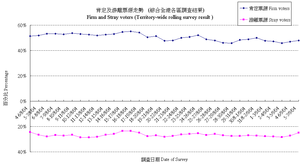 | The figures presented below are based on registered voters only, details are available at "Contact Information". All election surveys are sponsored by Civic Exchange. |