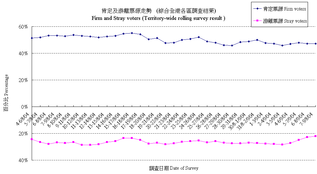 | The figures presented below are based on registered voters only, details are available at "Contact Information". All election surveys are sponsored by Civic Exchange. |